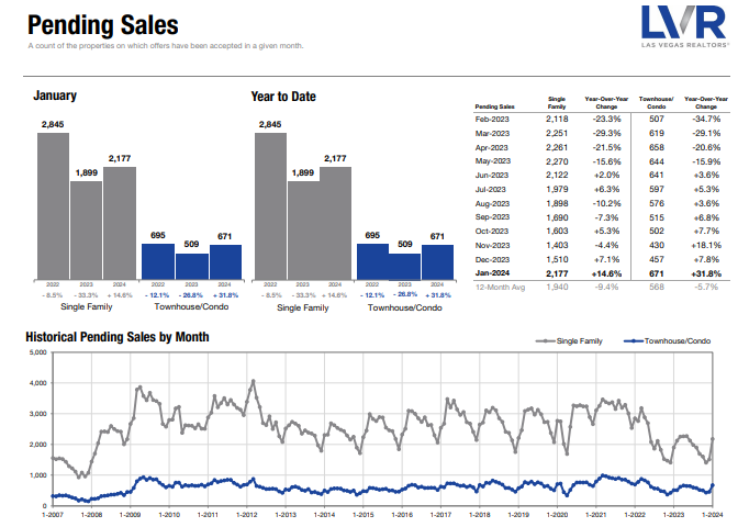 he Las Vegas Valley Real Estate Market is heating up, well ahead of projections (which were already positive for 2024). Pending sales rose over 44% from Dember to January and are up a staggering 14.6% year over year, all of this before the Fed has even met in March where many experts expect them to lower interest rates.